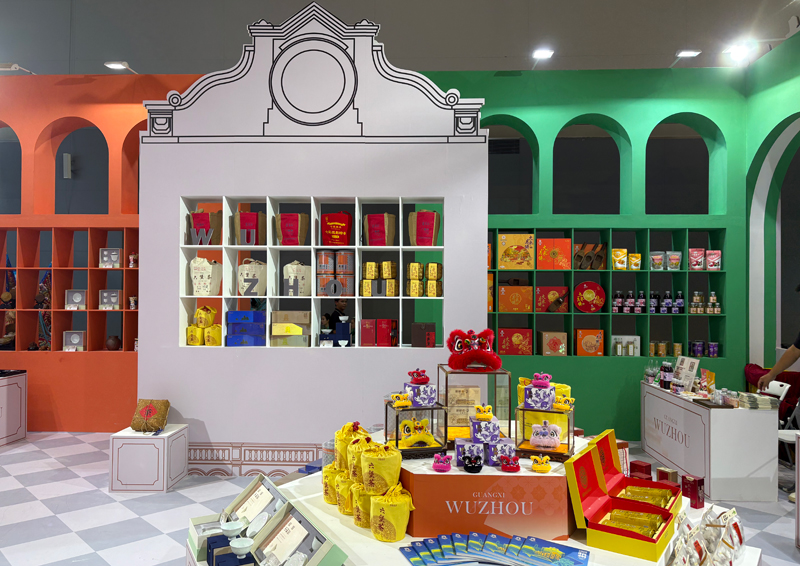 漫步百年骑楼,探寻岭南古韵。今年,梧州展馆创新采用骑楼造型,拱形窗门化身一个个展架率先映入眼帘,吸引游客前来沉浸式参观。梧州市文广体旅局精心策划,积极组织该市文旅企业踊跃参展,既有六堡茶、龟苓膏、大东月饼等“老字号”商品,也有中和瓷、狮舞文创、金砂玉等文化旅游产品以及玫瑰醋、鸭脚木蜂蜜、百香果干等县域名优特产,打造了一个“可逛、可吃、可玩”的展示平台。丰富的特色产品亮眼吸睛,生动展示了梧州文旅产业的多元魅力与创新活力。