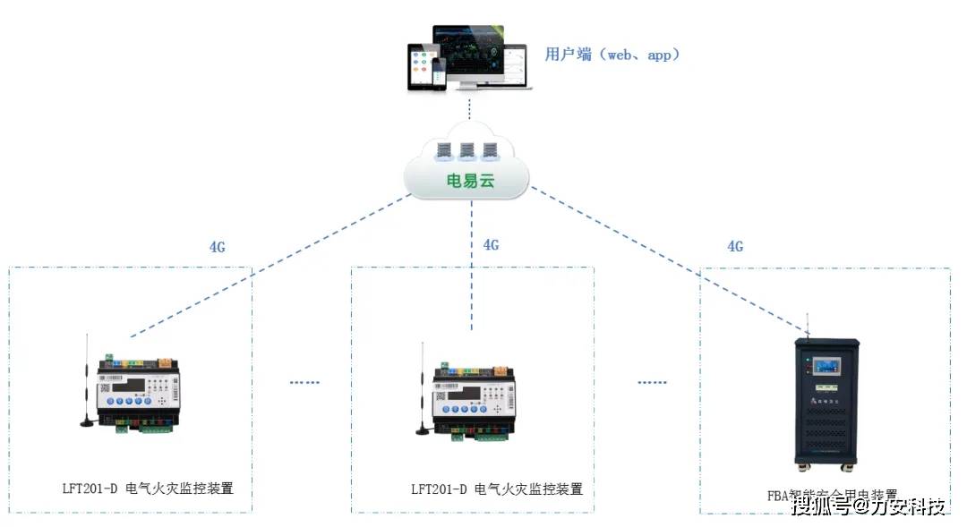 ●在各区域末端配电箱内加装LFT201-D用电安全探测终端,精准采集用电线路的电压、电流、温度、漏电等核心参数,通过4G网络方式接入 “电易云” 智慧电力物联网平台,打破空间限制,确保监测数据实时、稳定传输,为云端平台的数据分析与预警功能提供可靠数据保障。