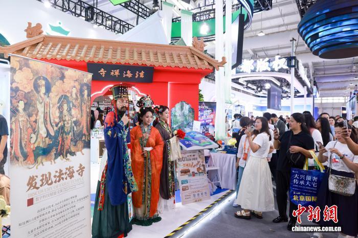 9月12日,在北京举行的2025年中国国际服务贸易交易会上,中国传统文化相关内容吸引观众的目光。图为数字科技赋能的文保项目《发现法海寺》的展台上,身着汉服的工作人员吸引观众。中新社记者 贾天勇 摄